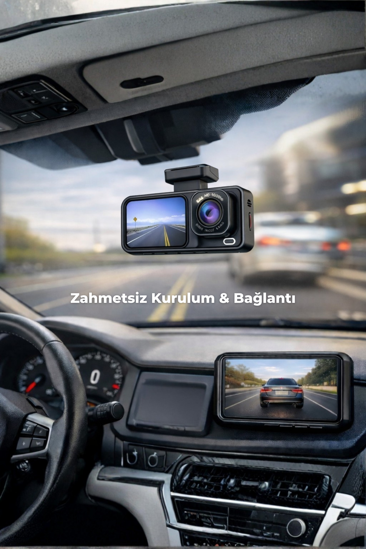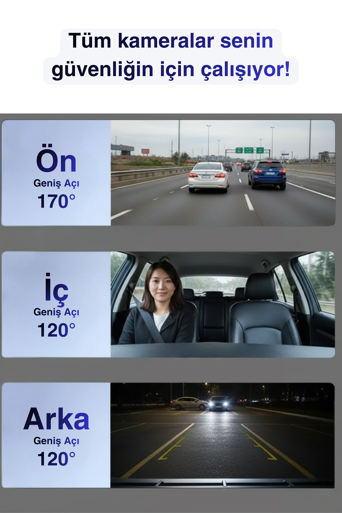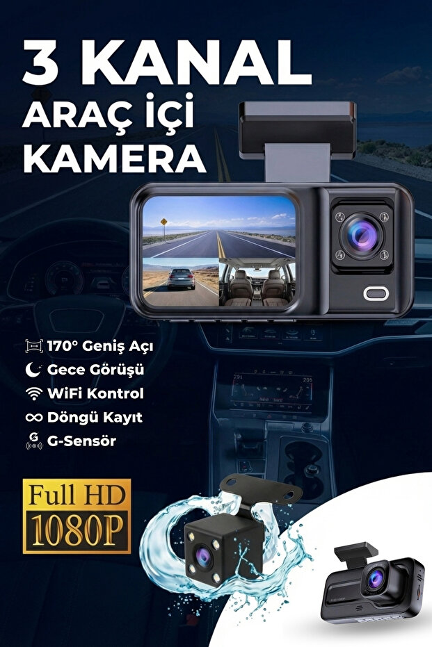3 Kanallı Araç İçi Kamera | Ön + Arka + İç Kamera | 1080P HD, Geniş Açı, Gece Görüşü, Döngü, WiFi